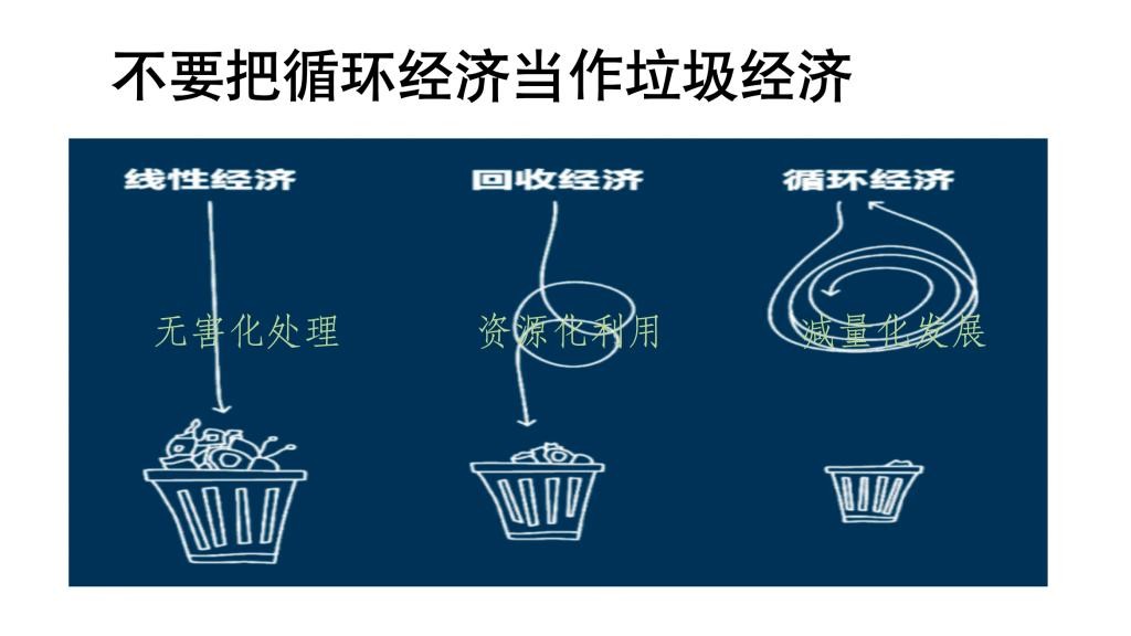 线性经济没有循环回路,只是对产生的废弃物进行无害化处理,因此GDP越高,资源开采越多,碳排放越多;回收经济仍然是线性经济,没有进入到生产核心过程中,尽管填埋回收使得废弃物减少了,但生产源头的废弃物总量没有减少,因此没有影响到产业;循环经济的关键是,要设计出一个整体的循环经济回路。