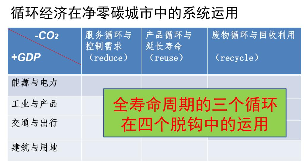 主旨演讲的最后,诸大建用一张图表总结,循环经济如何在净零碳城市中进行系统应用。他认为,循环经济未来20年的发展,需要从能源与电力、工业与产品、交通与出行、建筑与用地四大领域发力,每个领域都对应着3R。