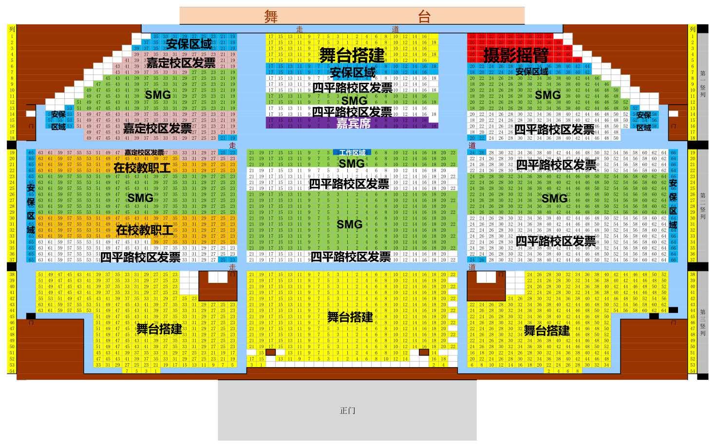 根据SMG活动性质,本次活动以在校大学生为主,本场演出时长预计为2.5小时。为确保本次活动能更好地为观众带来最震撼的视觉体验,同时因舞台搭建、舞台相关设备、以及消防安全通道等工作占用座位,现对本次艺术节闭幕式大礼堂的座位分票方案公布如下: