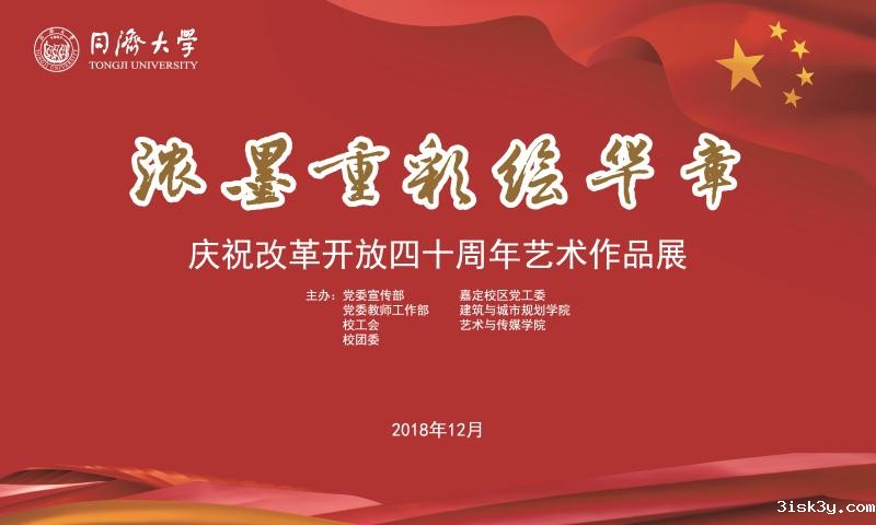 由党委宣传部、党委教师工作部等7家单位联合举办的“浓墨重彩绘华章”——庆祝改革开放40周年艺术作品展于12月21日在学校开展。该展览既是向改革开放40周年献礼,也是展示学校师生艺术文化素质。展出作品包括书法、国画、版画、篆刻、海报以及综合材料制作等近200幅作品。展览将持续至2019年1月20日,展览地点为四平路校区衷和楼大厅。