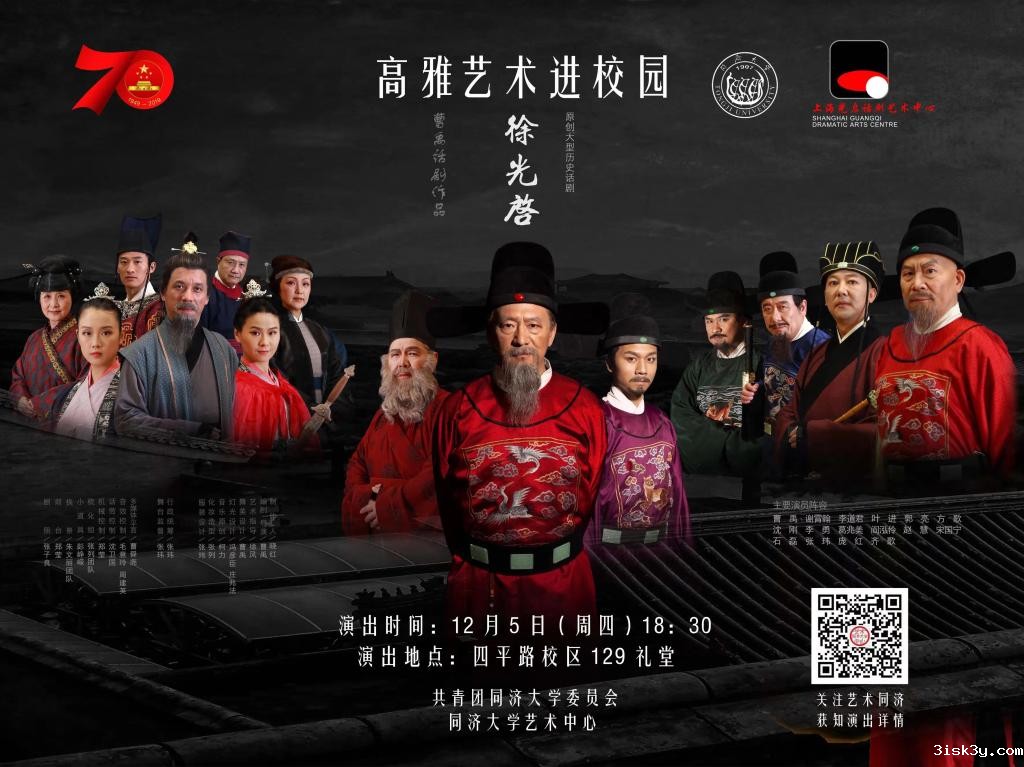 为弘扬社会主义核心价值观,传承经典作品,丰富校园文化生活,高雅艺术进校园《徐光启》话剧将在我校上演。