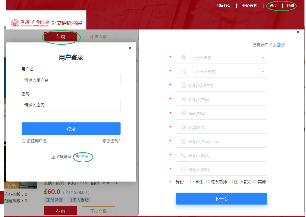 (3)如果找到心仪的书,请点击“荐购”。若没有注册请先注册,再登录。