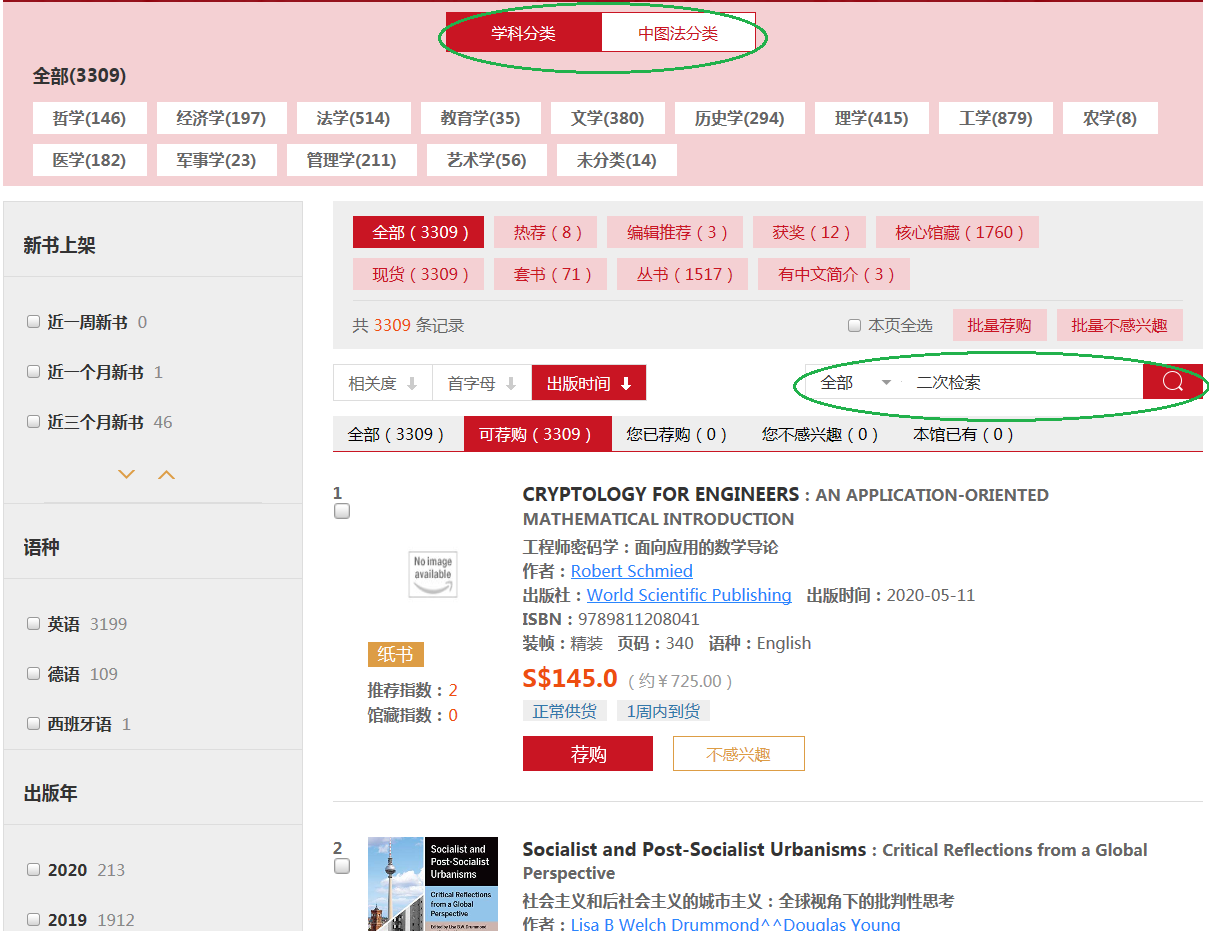 (2)在选书页面,可以分类浏览,也可以自己填写信息进行检索;