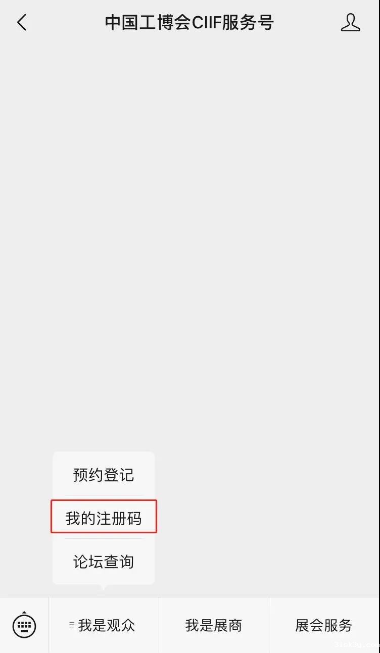 预登记完成以后,通过 “中国工博会CIIF服务号”底部菜单栏,点击“我是观众”→“我的注册码”,即可查看你的注册码。