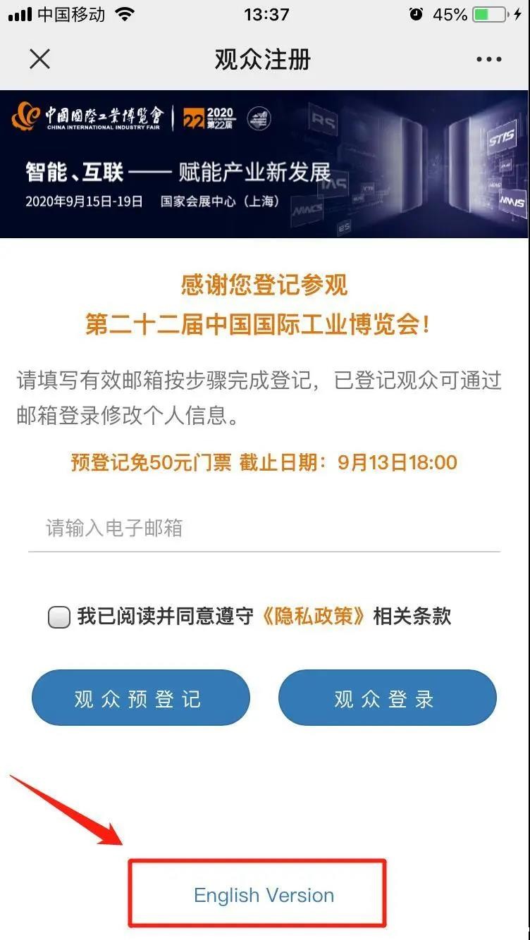 关注“中国工博会CIIF服务号”,点击菜单栏中“我是观众”→“预约登记”,按步骤完成预约登记,已登记观众可通过邮箱登录修改个人信息。