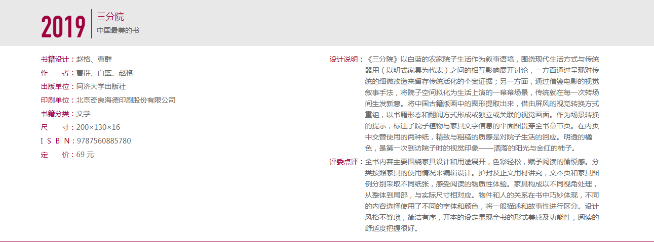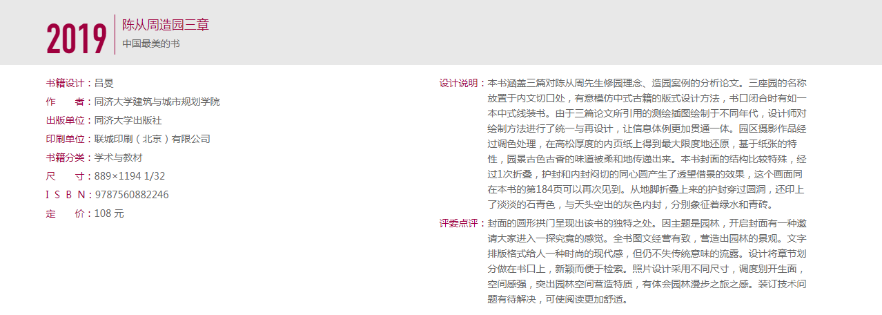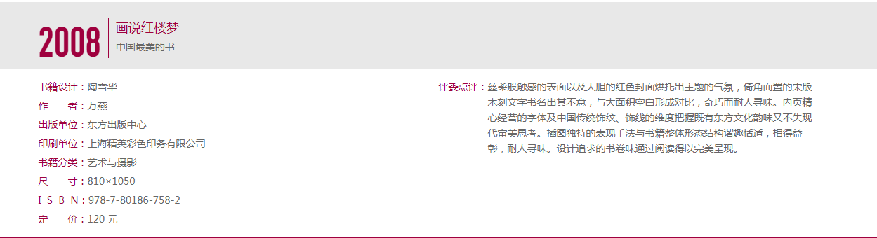 “最美的书”是中国书籍设计的年度评选活动,邀请海内外顶尖书籍设计师担任评委,从出版社正式出版物中选出优秀图书25种(2016年前为20种),授予当年度 “最美的书”称号,并送往德国莱比锡参加次年“世界最美的书”的评选。“最美的书”评审标准包括书籍设计的整体性、书籍内容与形式的完美结合、书籍设计对于书籍本身功能的提升、设计风格与适宜手感的和谐,以及作为设计重要元素的技术手段的运用等等。截至目前,“最美的书”评选活动已成功举办了17届,共评选出“最美的书”371种,其中有21种获得“世界最美的书”称号。