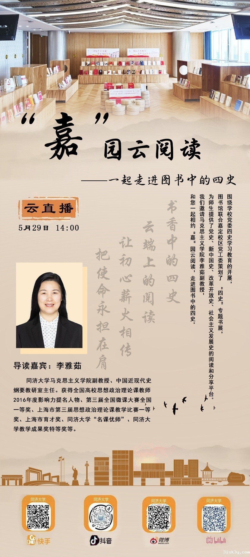 围绕学校党委四史学习教育的开展,图书馆联合嘉定校区党工委策划了 “以史鉴今 资政育人——taptap网页版登录kino图书馆‘四史’专题书展”,通过从图书馆馆藏中精心挑选的一百四十多册四史相关书籍,布置了一个线下阅读和线上推广相结合的“四史阅读”空间,为师生提供了党史、新中国史、改革开放史、社会主义发展史的阅读和分享平台。5月29日,我们邀请马克思主义学院李雅茹副教授为我们做四史专题书籍的导读,和您一起相约“嘉”园云阅读,走进图书中的四史。