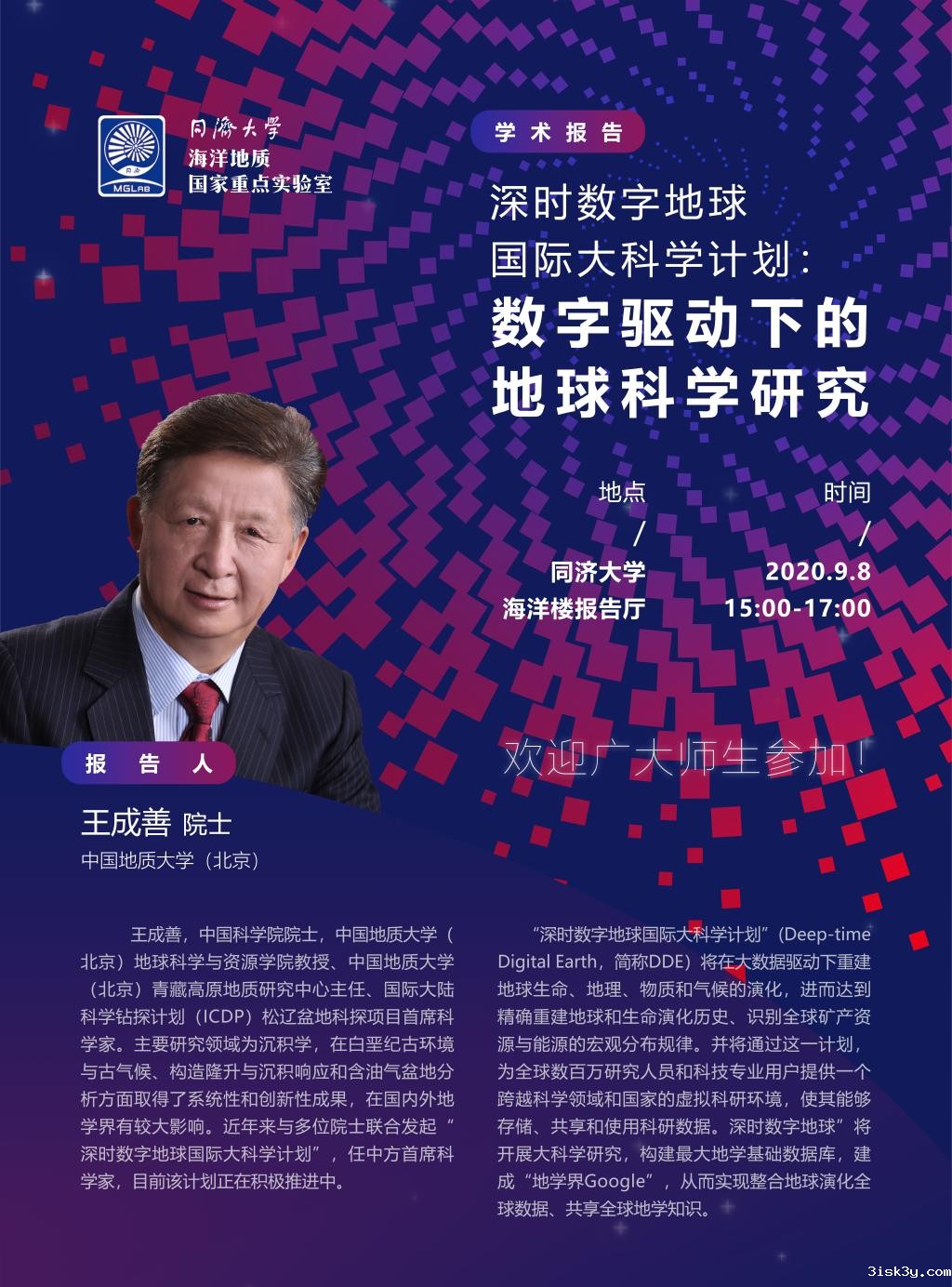 (9月8日)王成善院士报告:深时数字地球国际大科学计划:数字驱动下的地球科学研究
