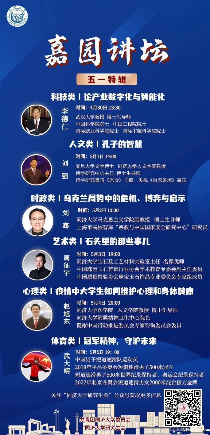 “嘉园讲坛”五一特辑还将继续举办5场报告会,邀请刘强、刘骞、周征宇、赵旭东、武大靖等校内外专家大咖围绕人文、时政、艺术、心理、体育等方面为同学们作线上专题报告,为同学们带来源源不断的知识“大餐”。