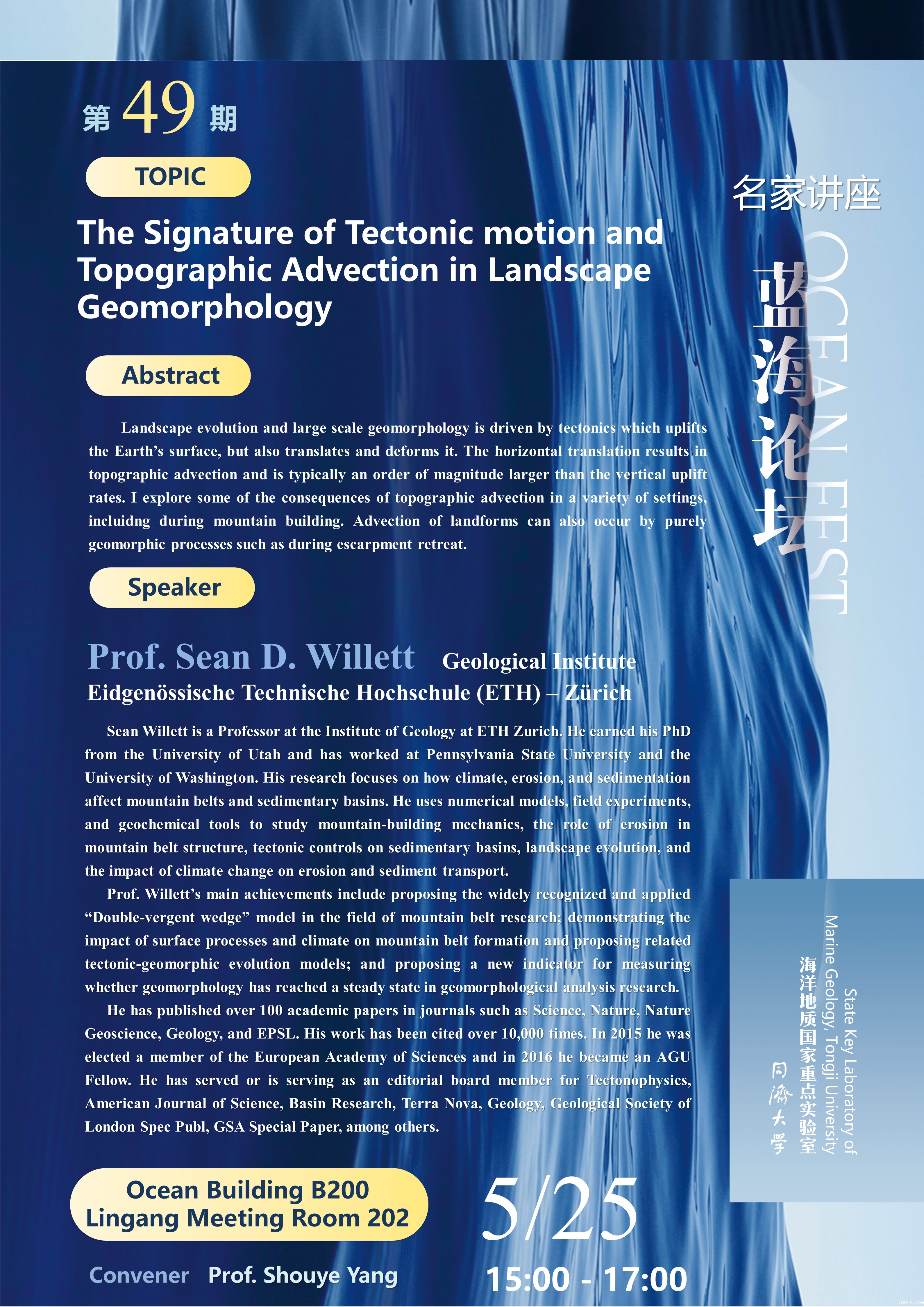 (5月25日)蓝海论坛:The Signature of Tectonic motion and Topographic Advection in Landscape Geomorphology