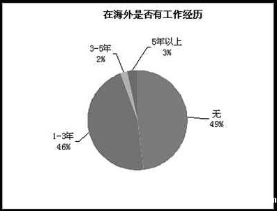 启德教育国际教育研究院近日发布《海归就业力调查》。由调查报告中提供的数据图(左图)可以看出,目前真实的情况是:高达95%的海归,其在海外工作经历少于3年。有72%的海归,月薪低于1万元人民币。相关专家认为,多数海归缺乏为用人单位所看重的海外工作经历,这是他们短期内薪金整体水平不高的主要原因。但海归在职场上的后发优势明显。