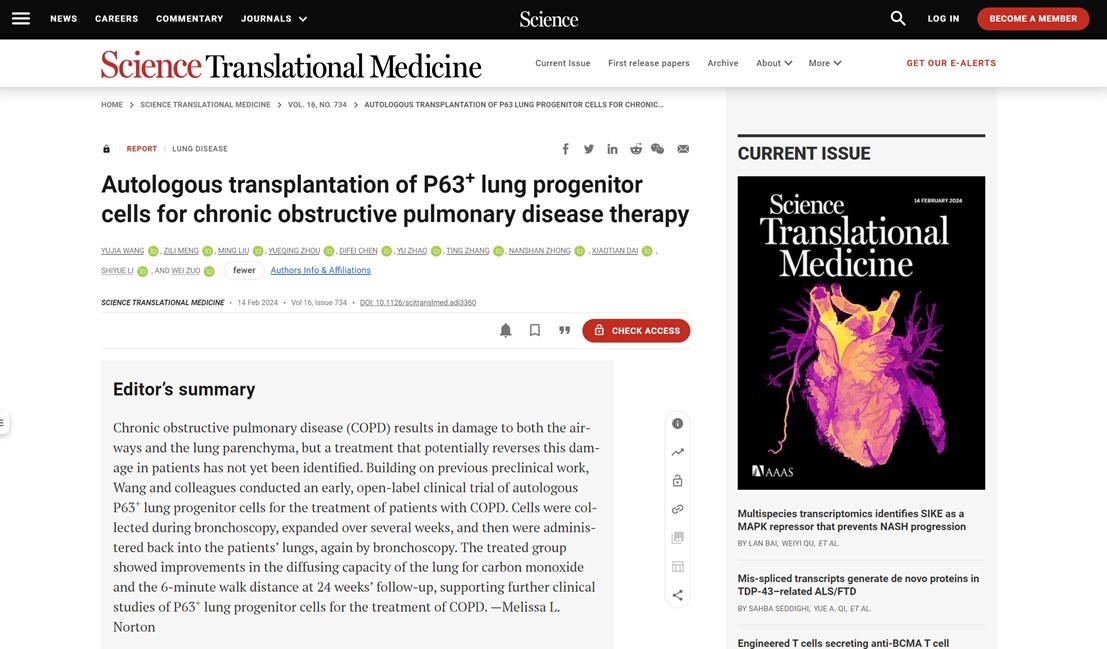左为团队报道全球首个肺前体细胞移植治疗慢阻肺临床试验成果,成果发表...